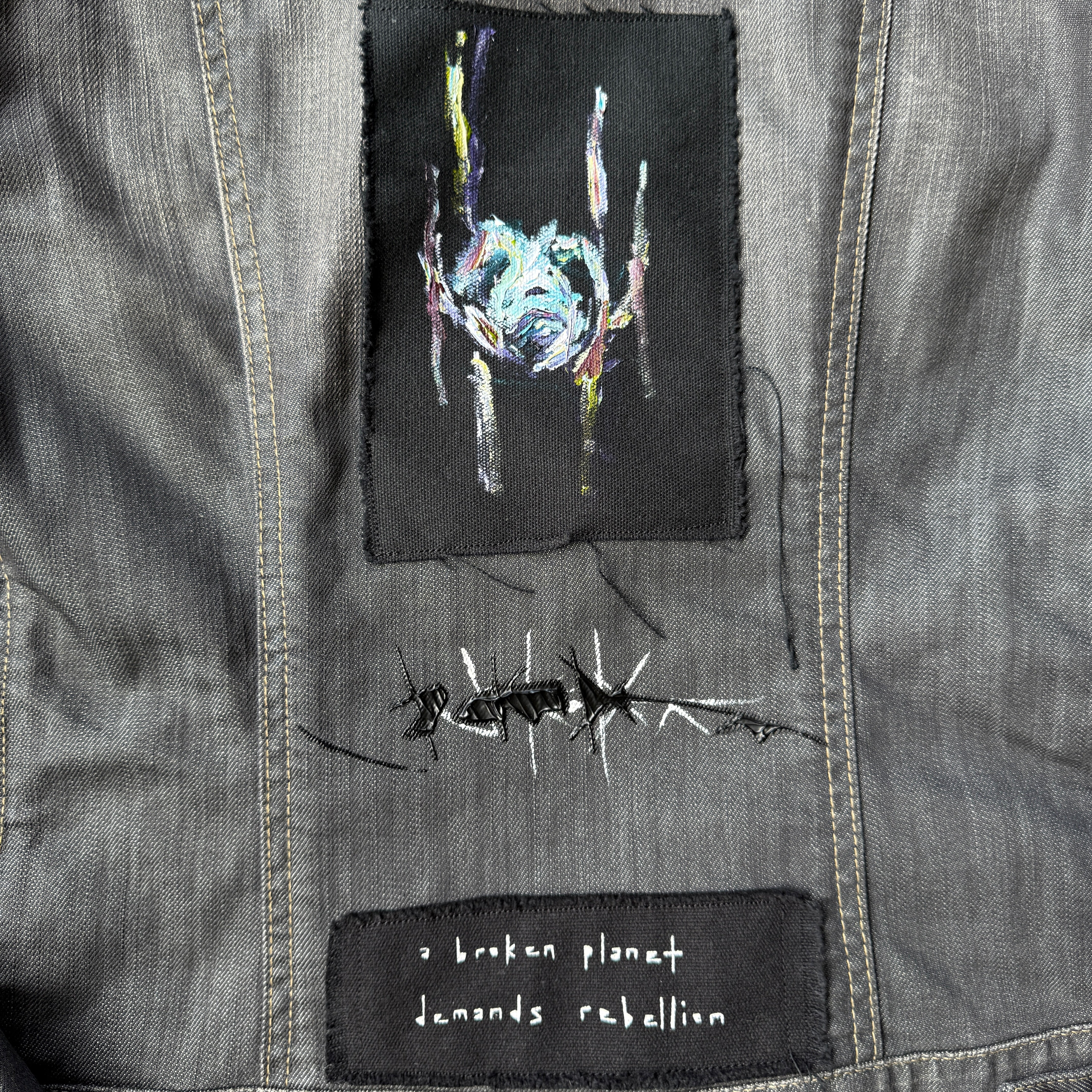 This jacket began as a pre-loved ESPRIT Ladies Size 12 Black denim jacket, rescued from waste and reimagined as one-of-one artisanal streetwear.
