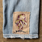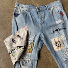 Rescued from landfill and reborn through patchwork and hand-painted detail, these pants are a true one-off.